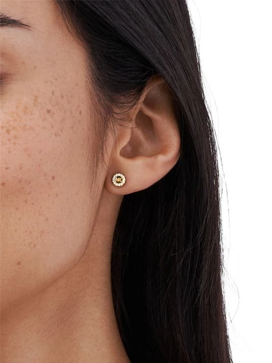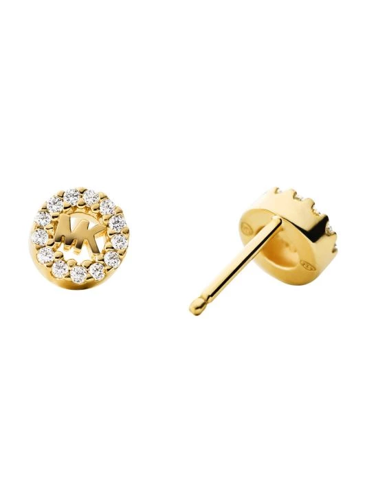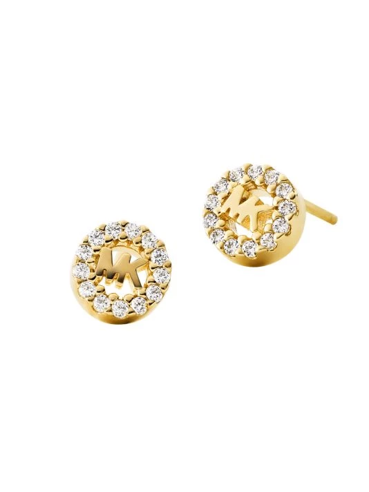Made of 14K-gold-plated sterling silver, Michael Kors’ round monogram stud earrings are bordered by shimmering white cubic zirconia. This versatile pair adds a polished, refined touch to any look.