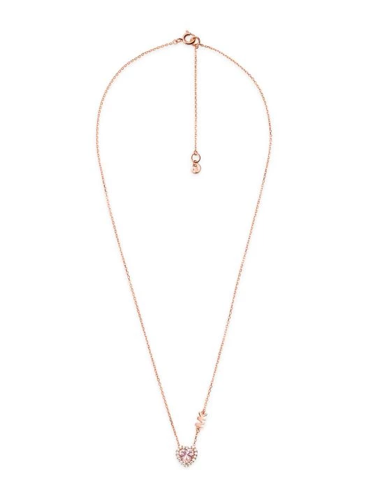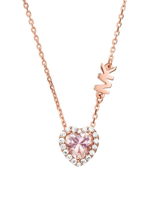 Michael Kors’ 14K-rose-gold-plated necklace features a heart-shaped pendant embellished with sparkling pink and white crystals. This romantic charm is suspended from a fine cable chain accented with the designer’s signature monogram logo.