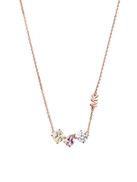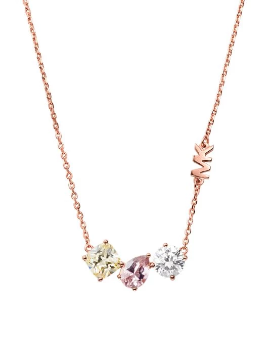 Crafted of 14K-rose-gold-plated sterling silver, Michael Kors’ necklace is embellished with multicolored cushion-, pear-, and round-cut cubic zirconia. These sparkling gemstones are fixed to a fine cable chain accented with a monogram logo charm.