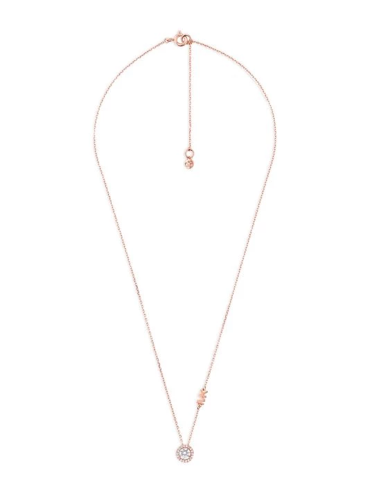 Michael Kors’ 14K-rose-gold-plated sterling silver necklace features a round cubic-zirconia-encrusted halo pendant fixed to a fine cable chain. Secured with a spring-ring clasp, this elegant piece is accented with the designer’s iconic monogram.