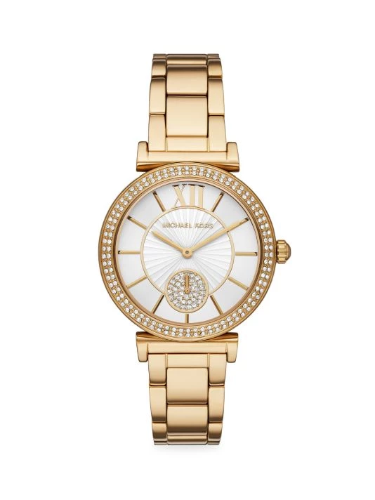 From the Abbey Collection. Michael Kors’ Abbey 36mm watch features a white sunray dial with goldtone stick indexes, pavé glitz topring, t-bar lugs and goldtone stainless steel bracelet.