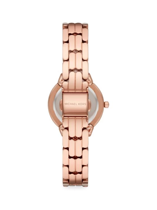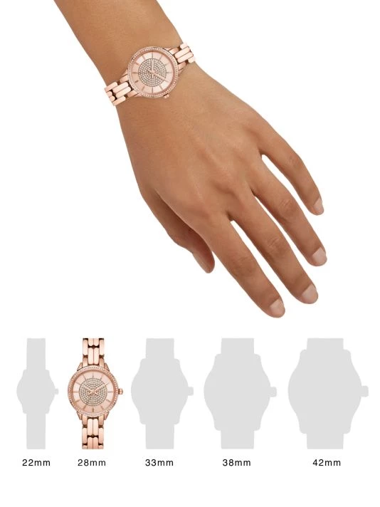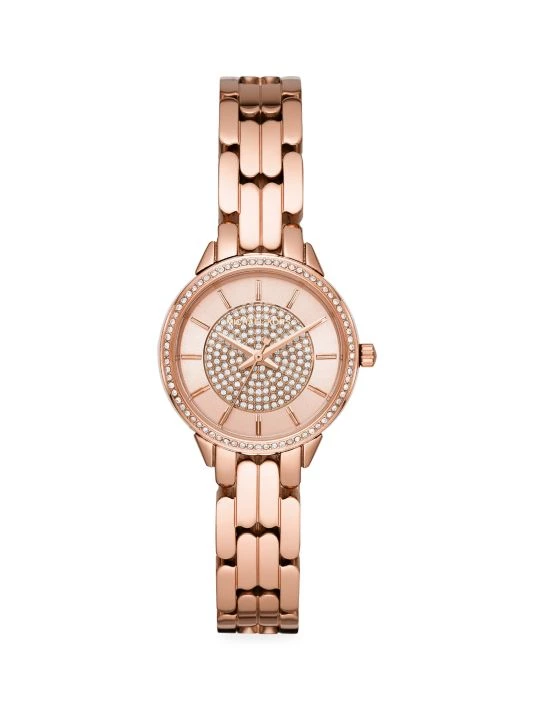 Elegant in polished rose goldtone stainless steel, this petite timepiece dazzles with sparkling pavé dial accents.