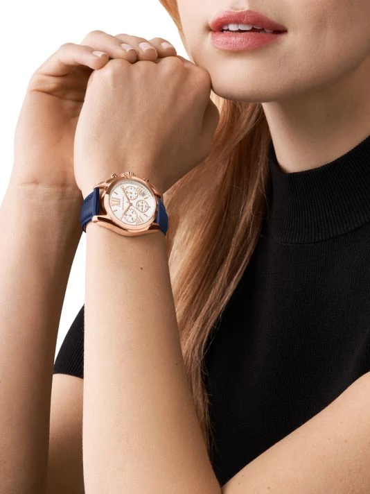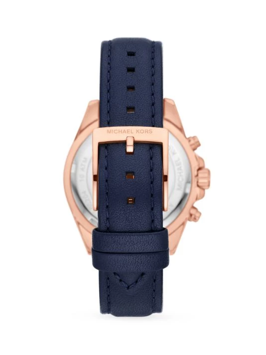 From the Bradshaw Collection. Michael Kors’ rose goldtone and leather chronograph watch is a fresh update of the label’s signature logo strap design, featuring a white dial and a minimalist aesthetic.