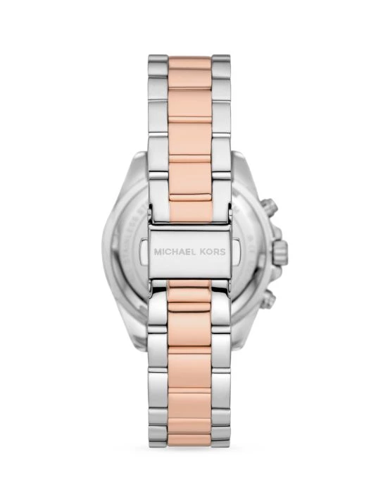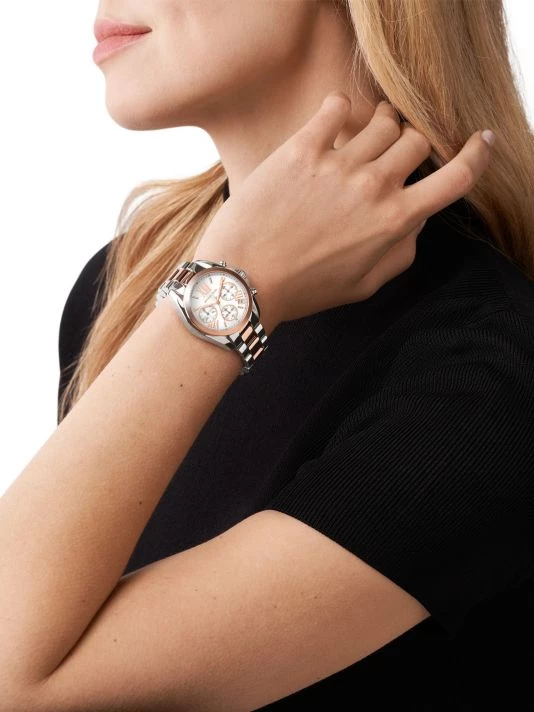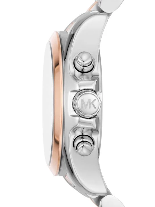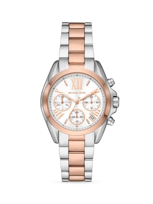 From the Bradshaw Collection. Micheal Kors’ two-tone stainless steel chronograph watch showcases a white dial with Roman numera indexes on a classic bracelet.