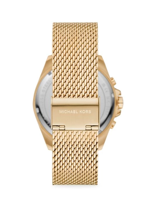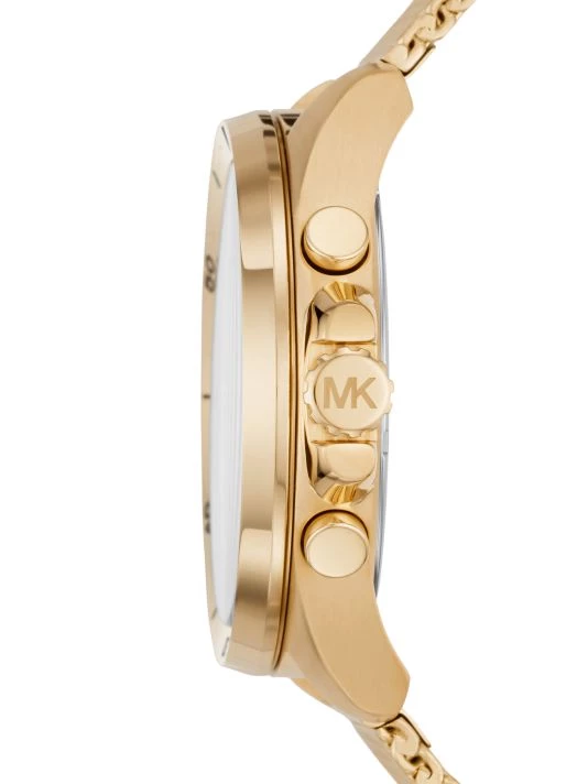 From the Brecken Collection. The Brecken watch features a black brushed dial with stick indexes, chronograph movement and gold-tone stainless steel bracelet.