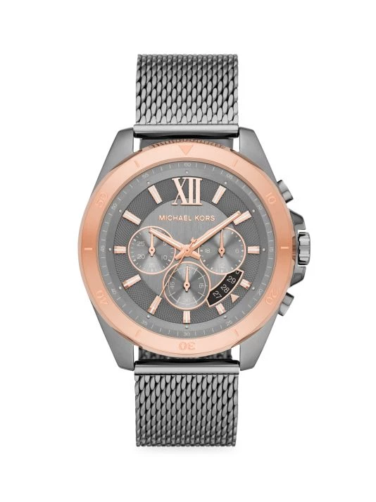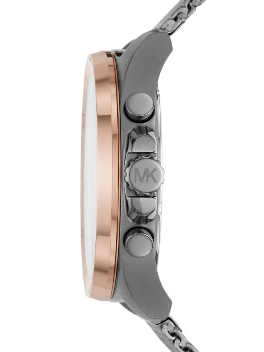 From the Brecken Collection. The Brecken watch features a gray brushed dial with stick indexes, chronograph movement, and a gunmetal stainless steel bracelet.