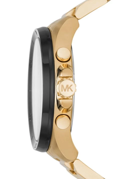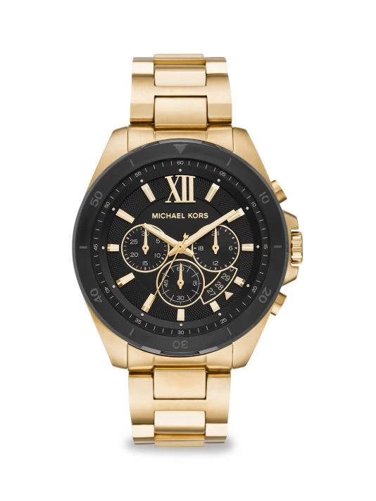 From the Brecken Collection. Combining a timeless silhouette with precision and style, the Brecken features an oversized silhouette with a tachymeter scale and chronograph mechanism for measuring time over distance. Designed in goldtone stainless steel with a bracelet strap for a signature finish.