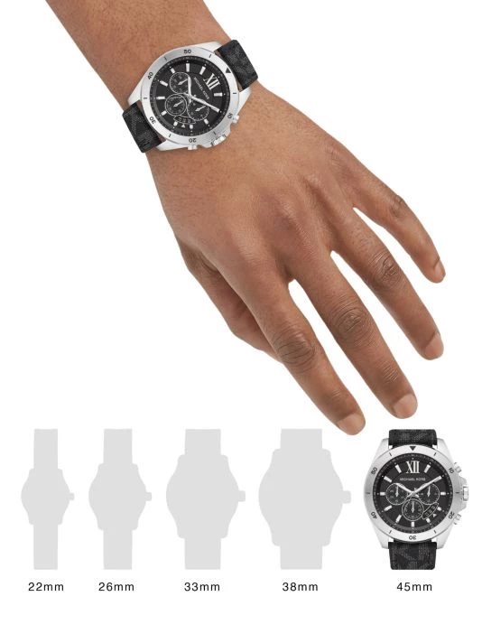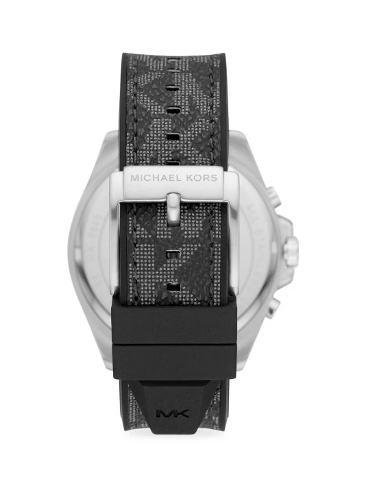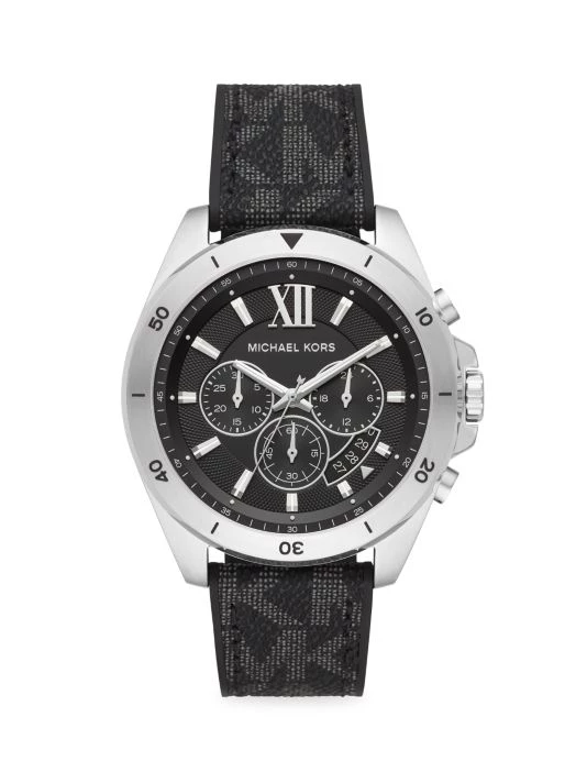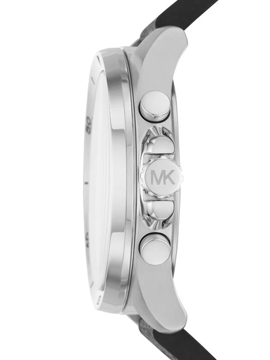 From the Brecken Collection. Combining a timeless silhouette with precision and style, the Brecken features an oversized silhouette with a tachymeter scale and chronograph mechanism for measuring time over distance. Designed in silvertone stainless steel with a logo-print black PVC strap for a signature finish.
