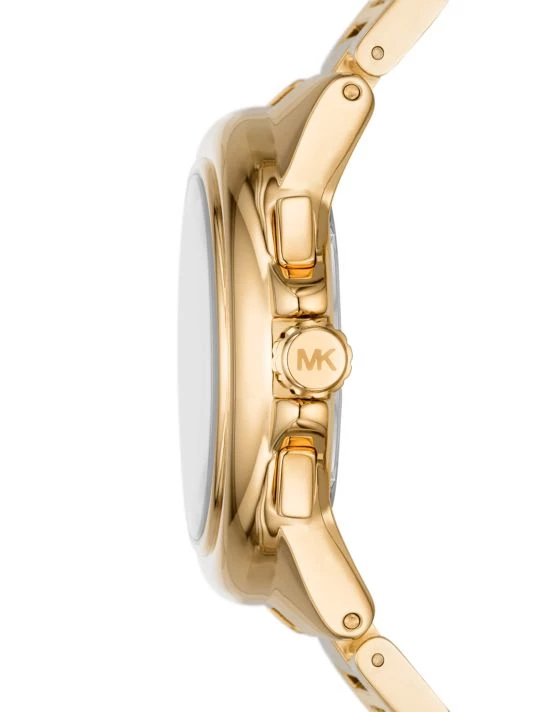 From the Camille Collection. Michael Kors’ goldtone stainless steel Camille watch boasts a round case, a white chronograph dial, and a date display between four and five o’clock. Secured with a polished bracelet, this sophisticated timepiece instantly elevates any ensemble.