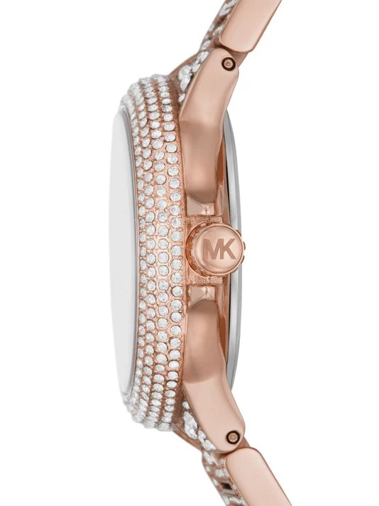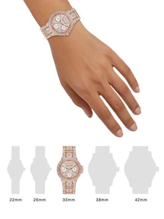 From the Camille Collection. Allover crystal pavé adds dramatic sparkle to this rose goldtone stainless steel watch.