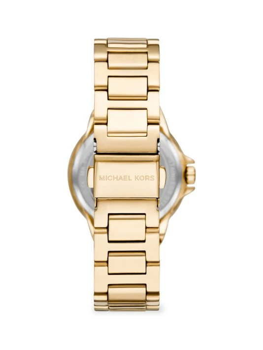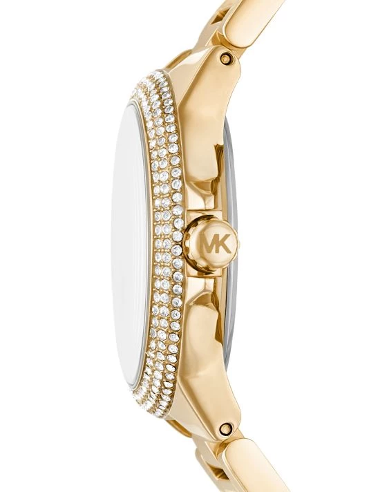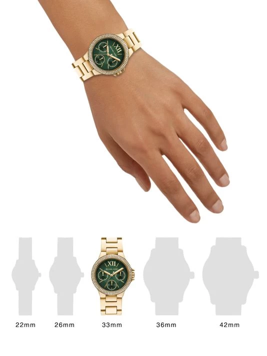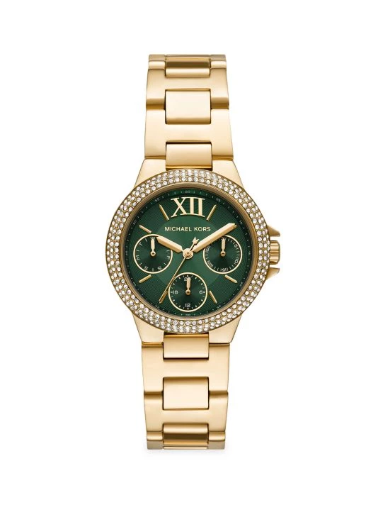 From the Camille collection. This 33mm watch features a green dial, gold pavé diamond bezel, and a gold-tone stainless steel bracelet.