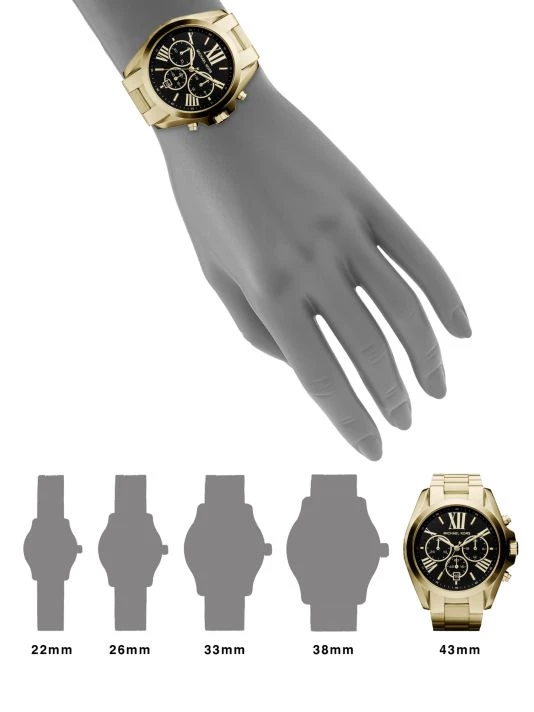 - Round polished goldtone ion-plated stainless steel case, 43mm (1.7″)