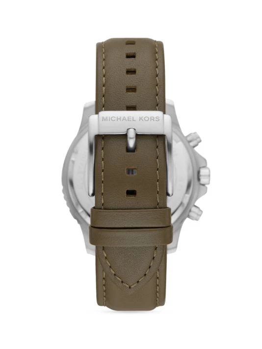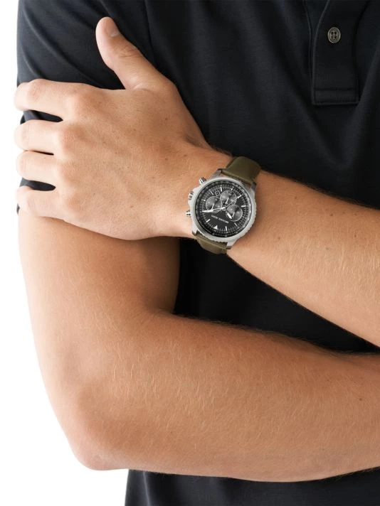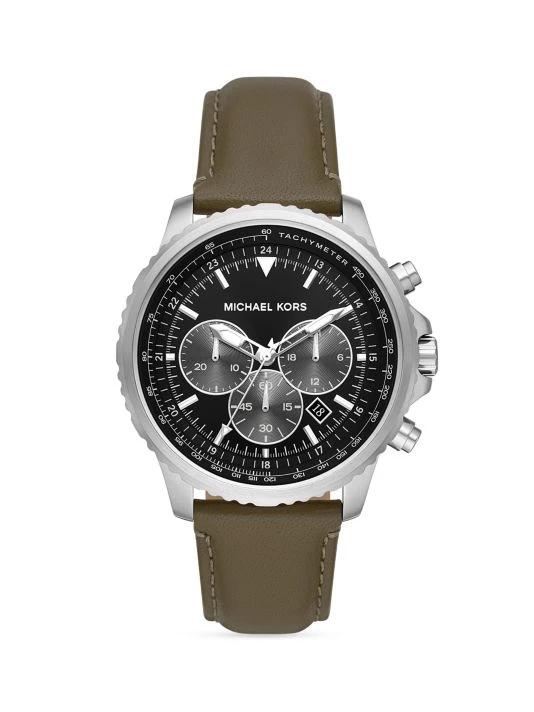 From the Cortlandt Collection. Secured with an olive leather strap, Michael Kors’ watch flaunts a round stainless steel case, a tachymeter bezel, and a black chronograph dial.