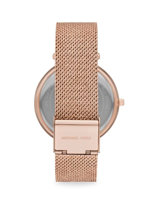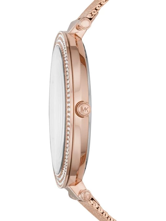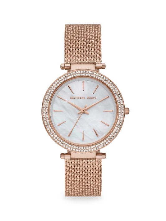 A topring of sparkling pavé adds a little glitz and glam to this radiant rose goldtone stainless steel watch with a mother-of-pearl dial and a shimmering crystal mesh strap