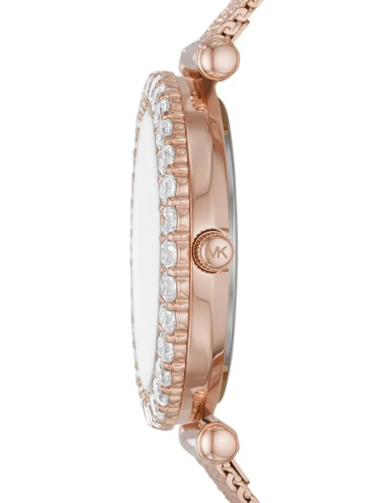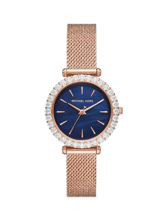 From the Darci Collection. A ring of oversized crystals adds shine to this mesh bracelet watch with navy dial.