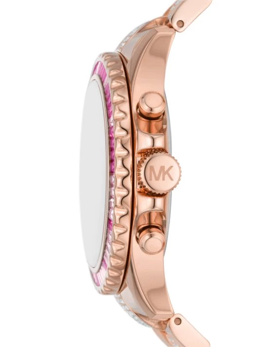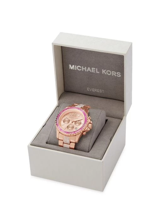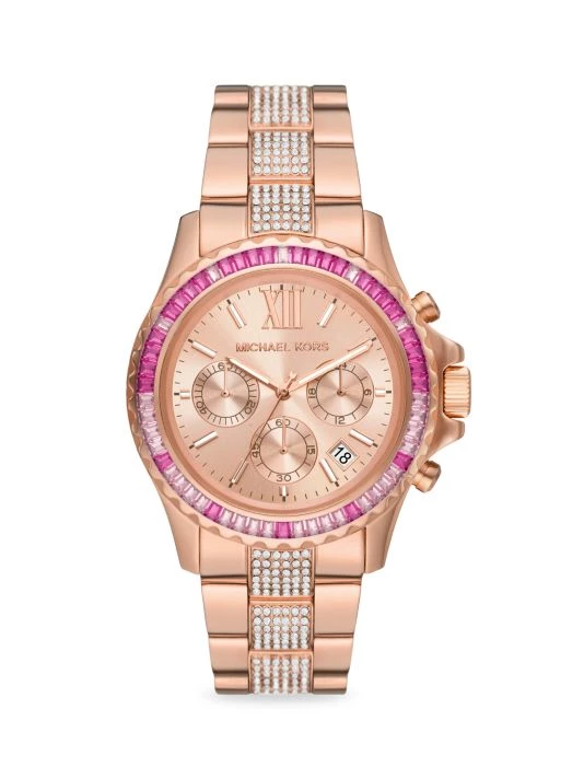 From the Everest Collection. A ring of light and dark pink baguette stones encircles this rose goldtone stainless steel watch, designed with three sporty subdials.