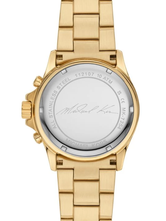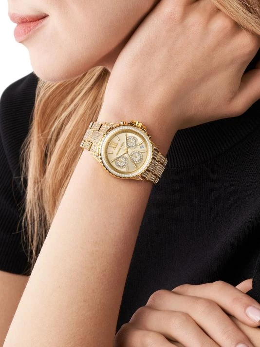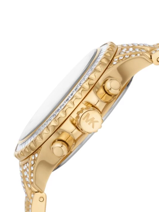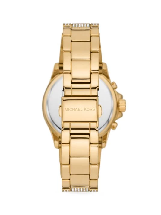From the Everest Collection. Michael Kors’ glamorous chronograph watch features a crystal pavé embellished goldtone case and bracelet.