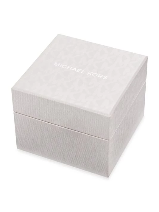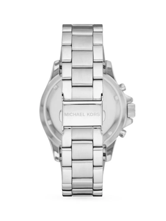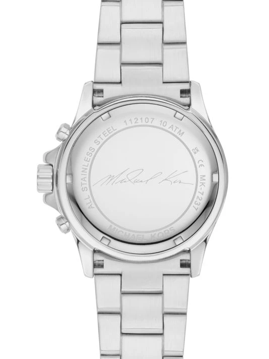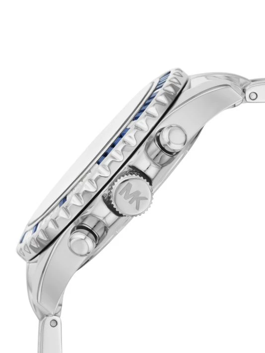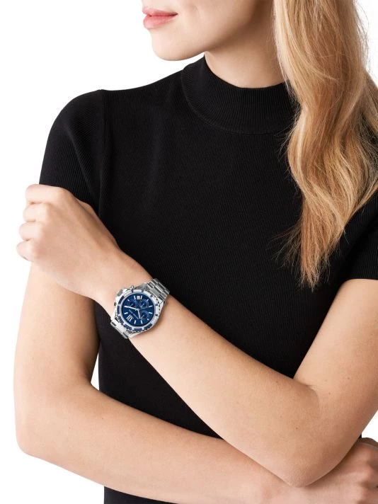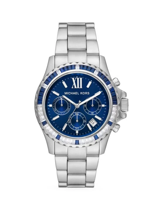 From the Everest Collection. Featuring a multi-link bracelet, Michael Kors’ chronograph watch showcases a two-tone baguette bezel and sleek blue dial.
