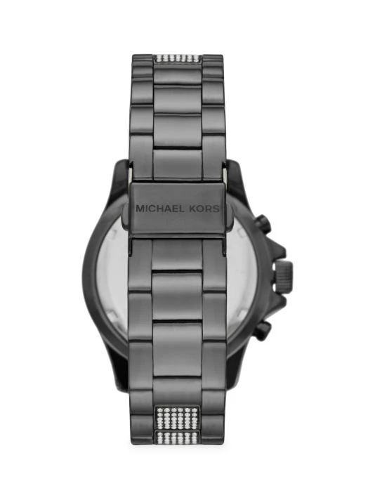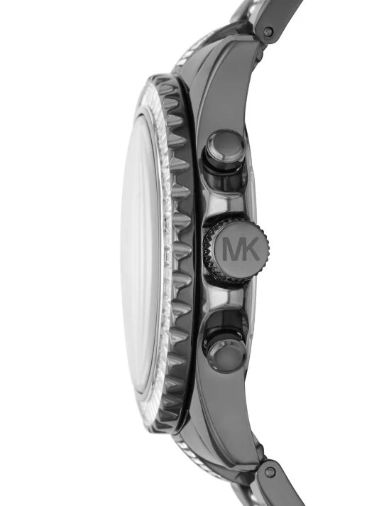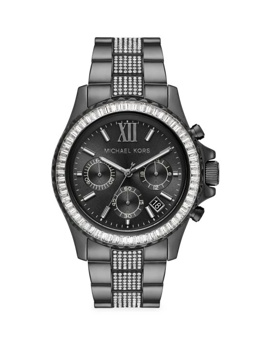 From the Everest Collection. Made of gunmetal-tone stainless steel, this chic chronograph watch is embellished with sparkling pavé and baguette crystals.