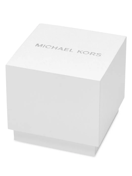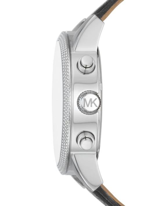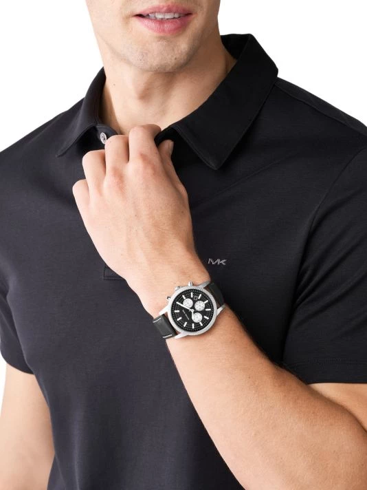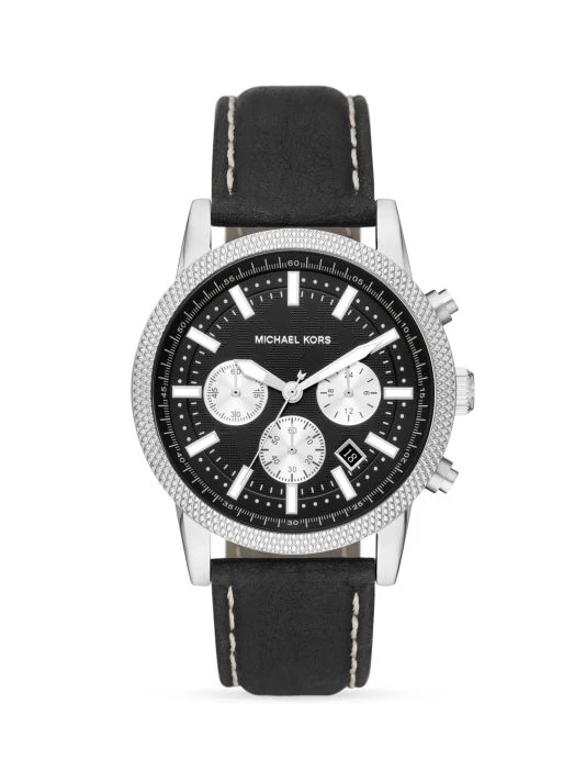 From the Hutton Collection. Michael Kors’ stainless steel chronograph watch features a black dial with a subtle logo print on a leather strap.