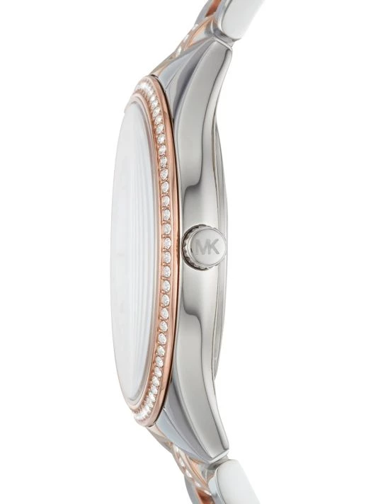 Refined watch with two-tone band and radiant mother-of-pearl dial.