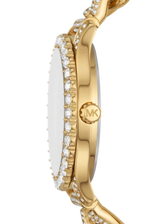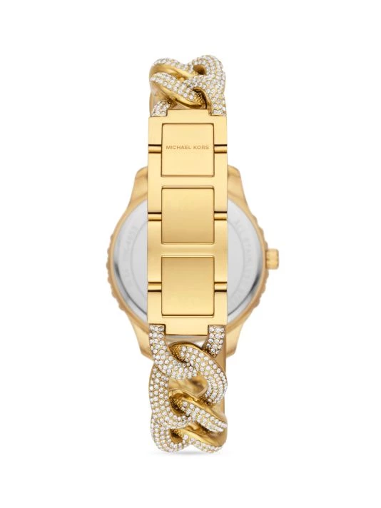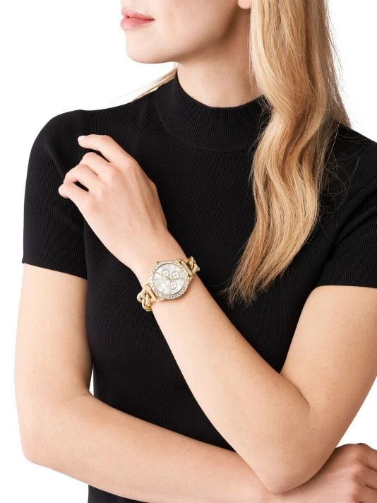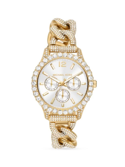 From the Layton Collection. Defined by the sparkling crystal adornments, Michael Kors’ stunning multifunctional goldtone watch is detailed with a polished case, three sub-dials, and a chunky chain-link bracelet.