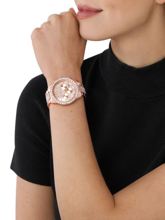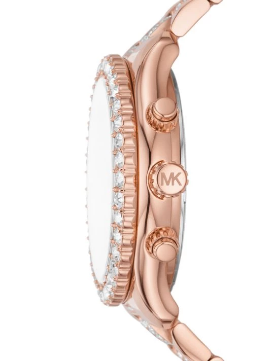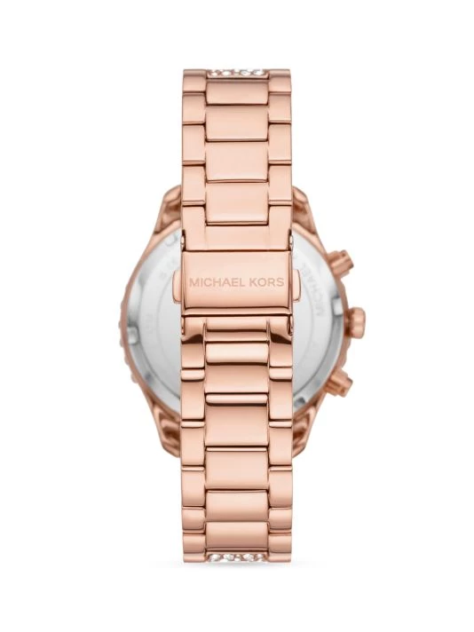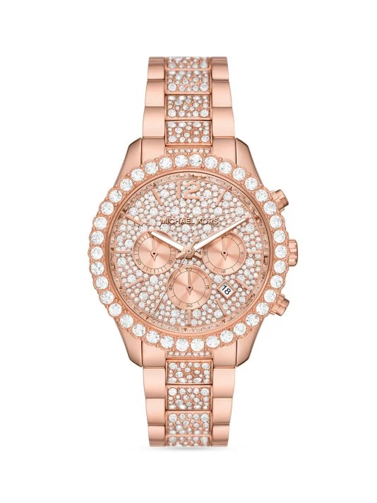 From the Layton Collection. Made of rose-goldtone stainless steel, Michael Kors’ watch brilliantly shimmers with pavé crystals at the bracelet, bezel, and chronograph dial.