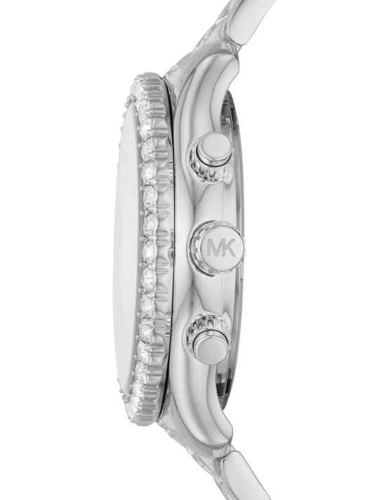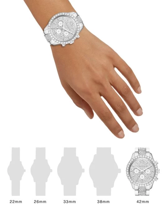 From the Layton Collection. Crafted of stainless steel embellished with sparkling pavé crystals, this exquisite watch boasts a round oversized case and a chronograph dial.