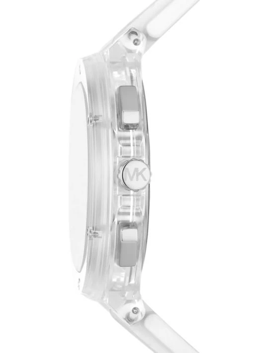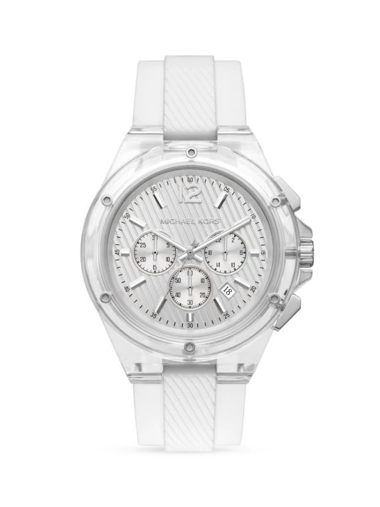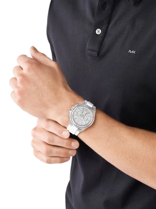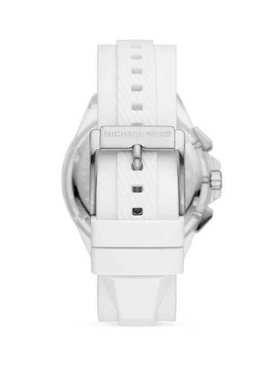 From the Lennox Collection. This sleek, sporty chronograph watch by MIchael Kors’ features a translucent bezel, white stripe dial, and tonal silicone bracelet strap.
