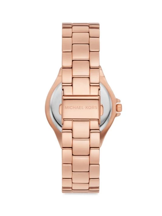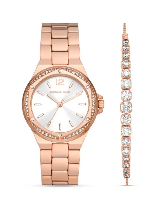 From the Lennox Collection. Made of rose-goldtone stainless steel embellished with sparkling crystals, Michael Kors’ watch boasts a silvertone sunray dial and baton hour markers. This exquisite timepiece comes with a matching slider bracelet, making this duo that perfect gift for any occasion.