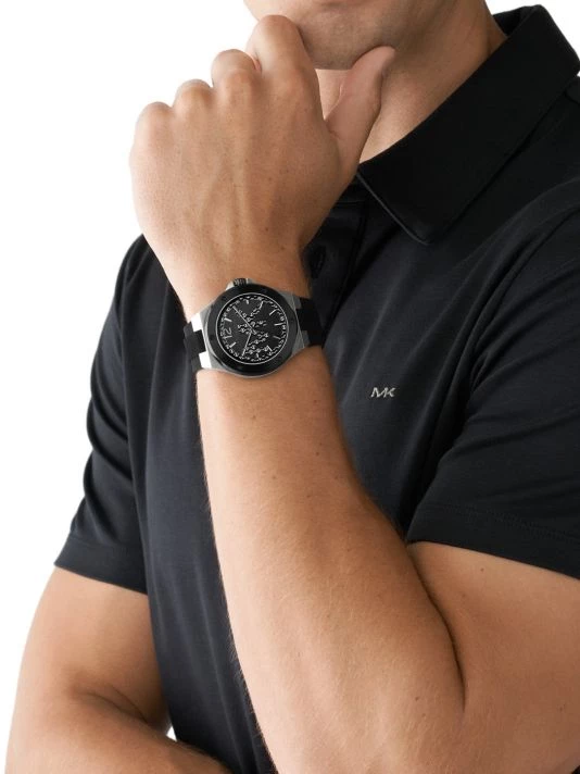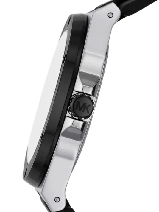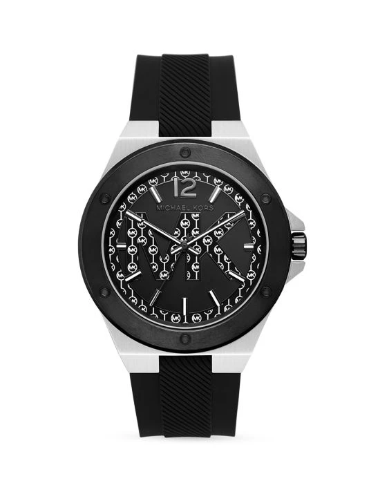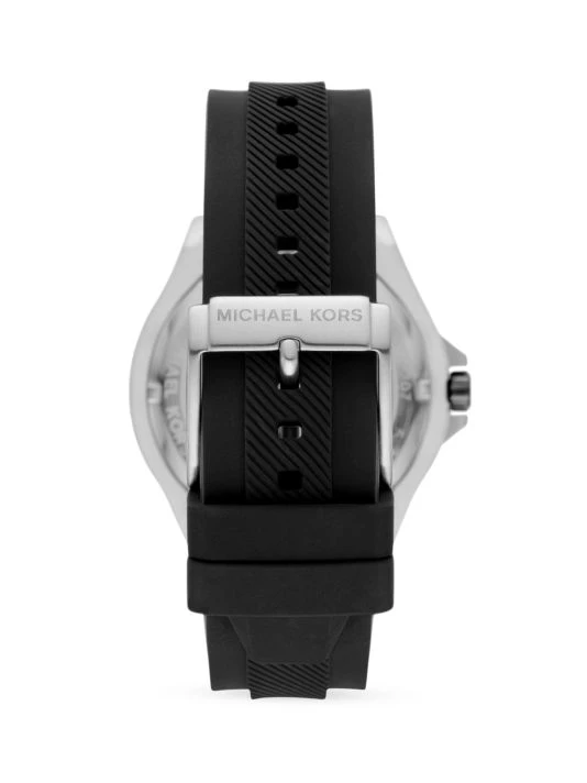 From the Lennox Collection. Secured with a black silicone strap, Michael Kors’ stainless steel watch features a black and white logo-print dial.