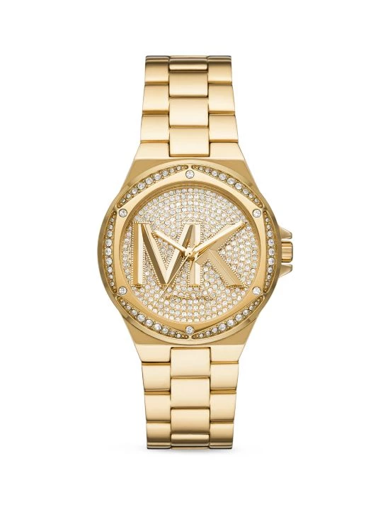 From the Lennox Collection. Designed with a pavé dial and top-ring, this goldtone watch features a bold logo.