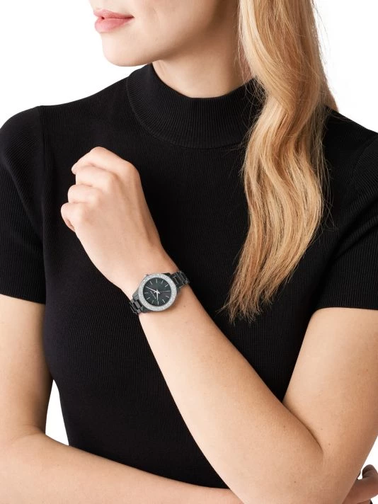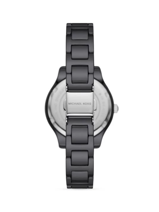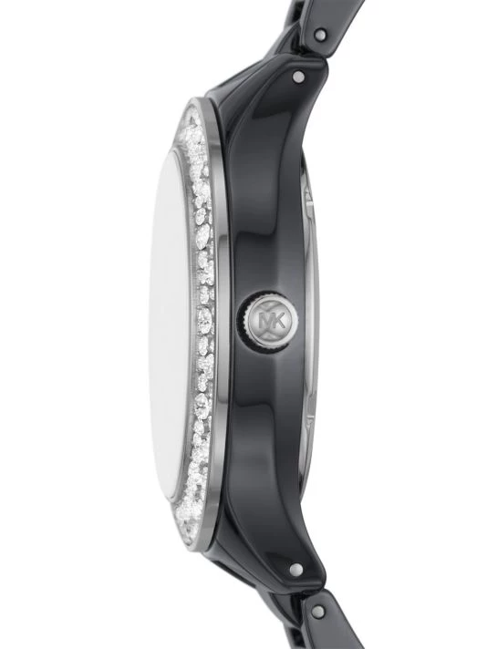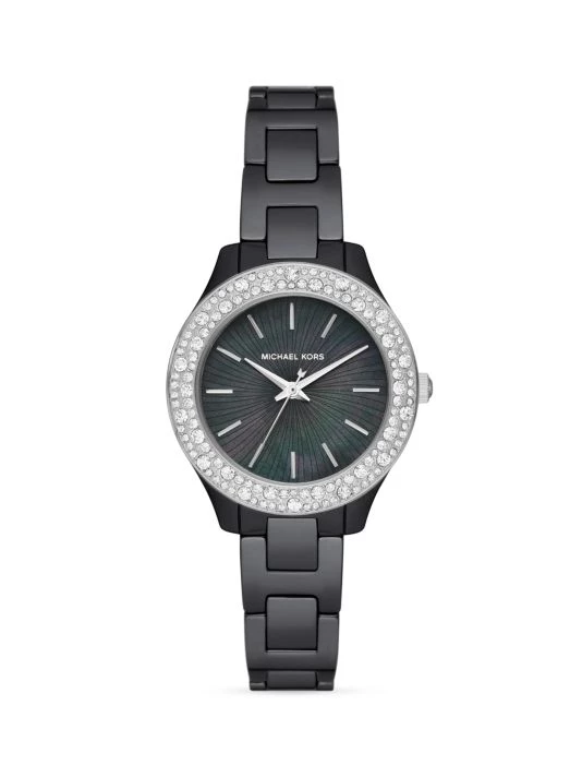 From the Liliane Collection. Michael Kors’ revamped its signature watch featuring a glamorous crystal pavé bezel and mother-of-pearl dial on a ceramic bracelet.