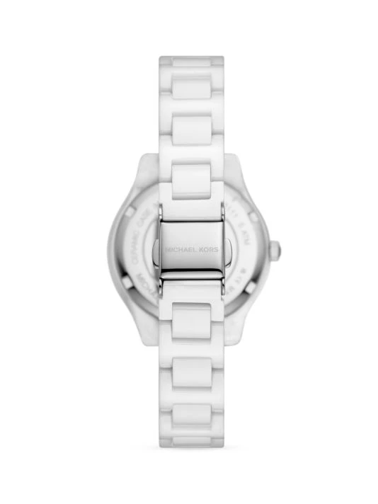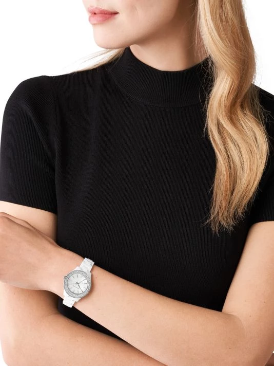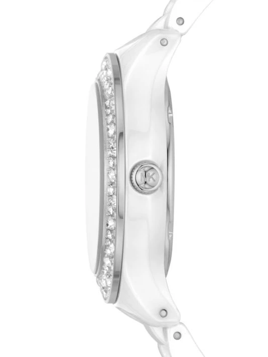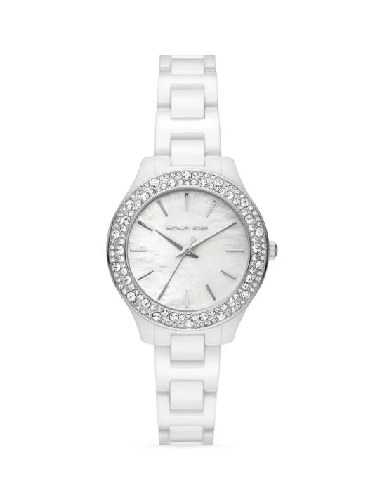 From the Liliane Collection. Featuring a crystal pavé bezel, Michael Kors’ three-hand watch showcases a stainless steel case and an iridescent mother-of-pearl dial, secured with a multi-link ceramic bracelet.