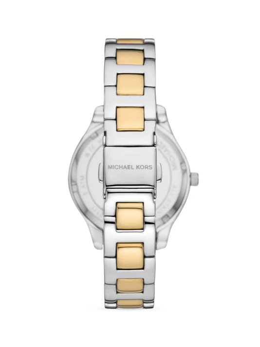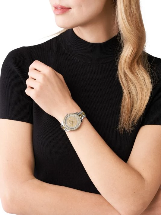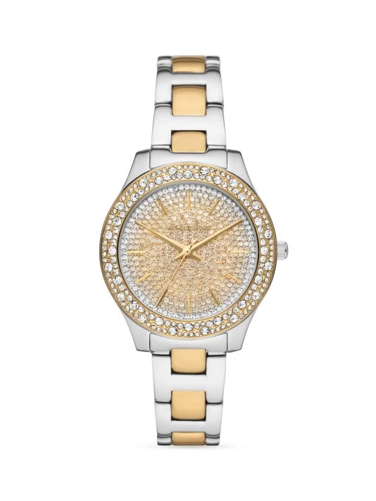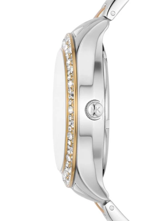 From the Liliane Collection. Crafted of silvertone and goldtone stainless steel, Michael Kors’ bracelet watch makes a glamorous statement with its crystal-encrusted dial and bezel.