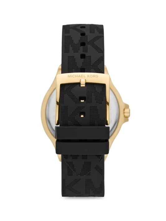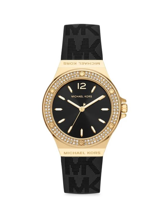 From the Lennox Collection. Secured with a black silicone logo strap, Michael Kors’ watch flaunts a round goldtone stainless steel case, a crystal-encrusted bezel, and a black dial.