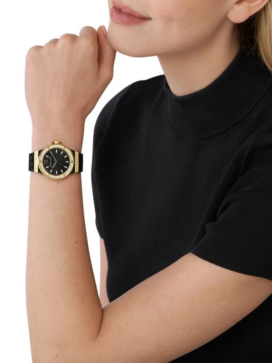 - Goldtone stainless steel case/black silicone logo strap