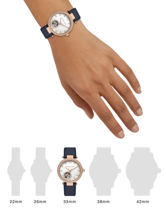- Textured mother-of-pearl dial with glitz indexes and skeleton feature