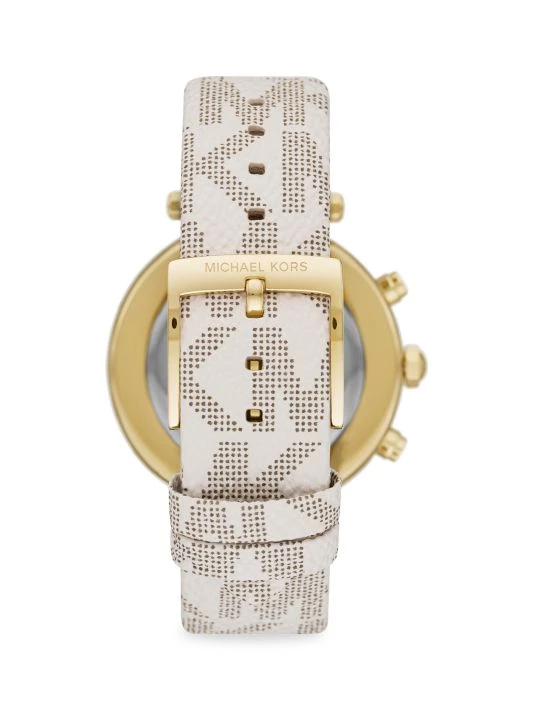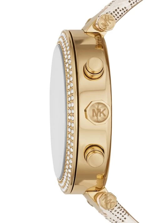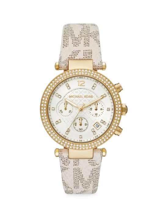 From the Parker Collection. Chic timepiece in an oversize silhouette cast in goldtone sterling silver trimmed with sparkling pavé stones for an elegant, uptown sensibility. A white sunray dial with a logo center showcases the chronograph movement and glitz indexes. Finished with a logo-print vanilla PVC strap.