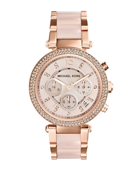 From the Parker Collection. Pearly links join rose goldtone stainless steel links in this full-function chronograph with a touch of sparkle.