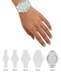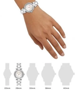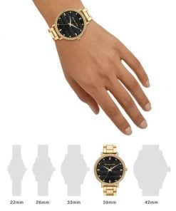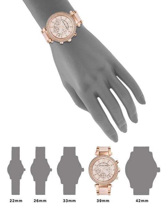 - Round polished rose goldtone stainless steel case, 39mm diameter (1.55″)