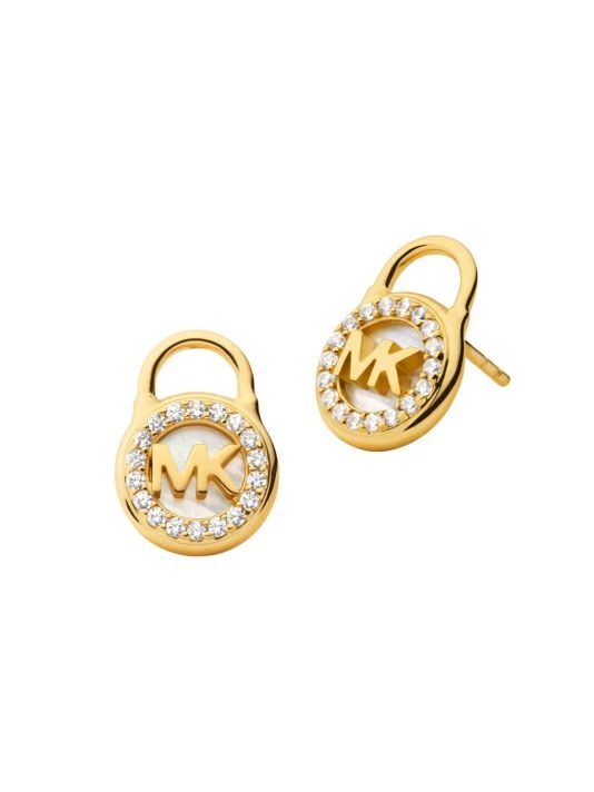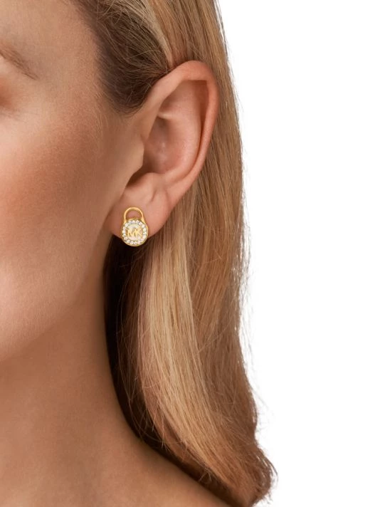 From the Premium Collection. Stamped with the label’s signature MK logo, Michael Kors’ stud earrings feature mother of pearl locks framed with glistening pavé stones.