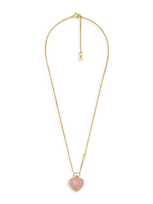 From the Premium Collection. Crafted of 14K gold-plated sterling silver, Michael Kors’ necklace features a rose quartz locket pendant accented with pavé cubic zirconia stones on a logo-detailed chain.