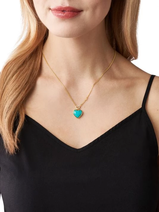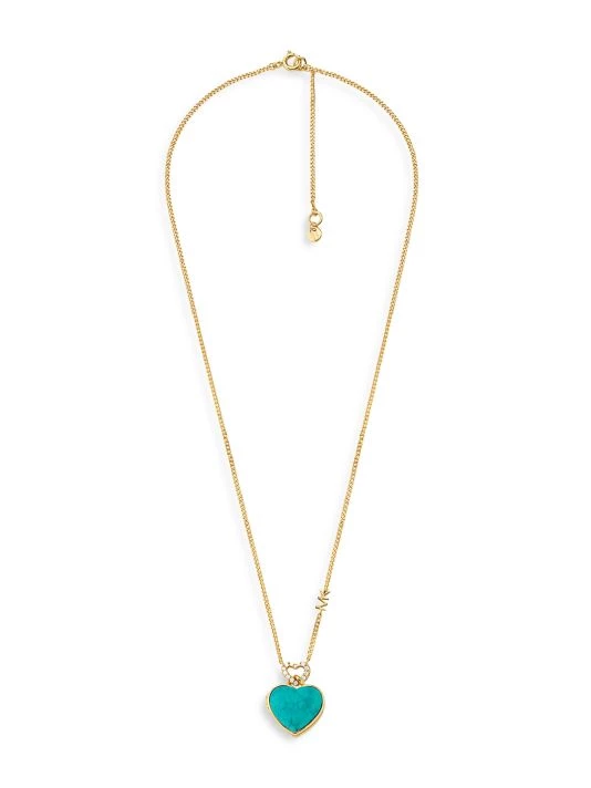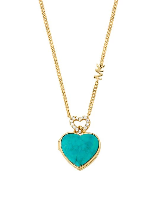 From the Premium Collection. Made of 14K gold-plated sterling silver, Michael Kors’ stunning necklace features a heart locket pendant with reconstituted turquoise and sparkling pavé cubic zirconia stones.