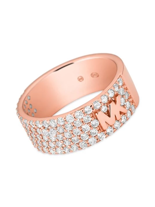 From the Premium Collection. Michael Kors’ 14K-rose-gold-plated ring shimmers with a handcrafted arrangement of cubic zirconia stones and a logo accent on the band.