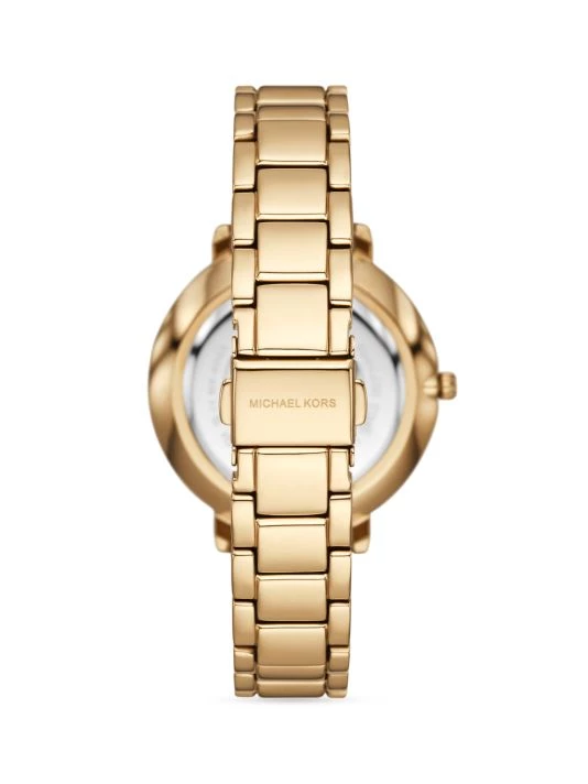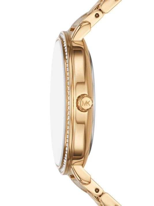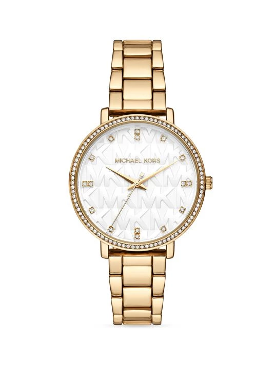 From the Pyper Collection. Michael Kors’ goldtone watch flaunts a round case, a white logo-stamped dial, and a crystal-encrusted bezel. Secured with an elegant bracelet, this understated accessory captures the label’s chic, sophisticated aesthetic.
