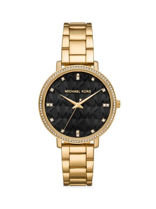 From the Pyper Collection. Featuring a black stamped logo dial with crystal hour markers, this elegant goldtone stainless steel watch is accented with pavé crystals at the bezel.