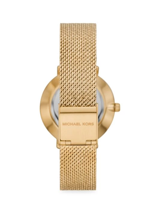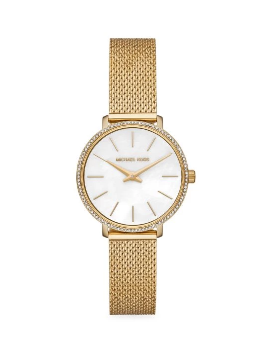 From the Pyper Collection. Michael Kors’ Pyper 32mm watch features a white mother-of-pearl dial with goldtone stick indexes, goldtone case with a pavé topring, two-hand movement and crystal mesh goldtone stainless steel bracelet.