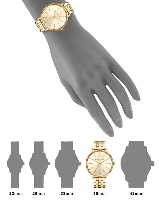 From the Pyper collection. This 38mm Pyper watch features a gold-tone sunray dial with gold-tone stick indexes, three-hand movement and faceted gold-tone stainless steel bracelet.