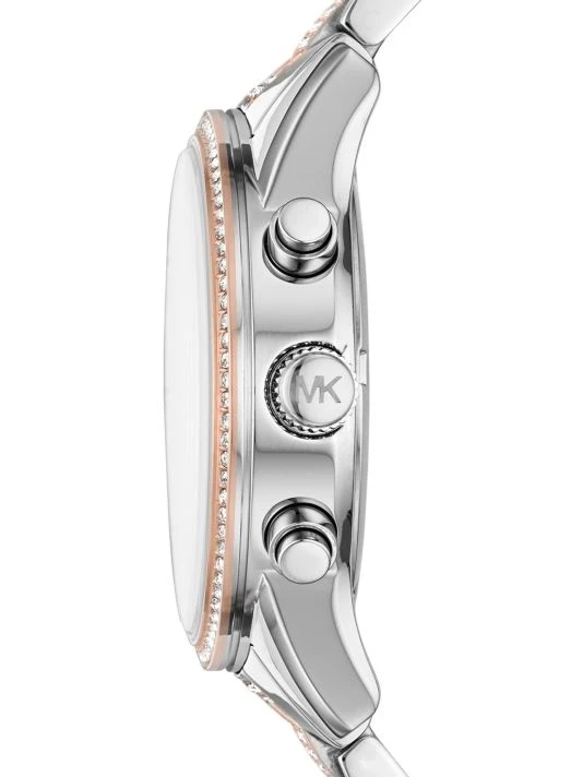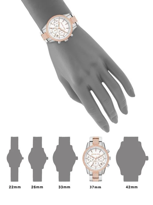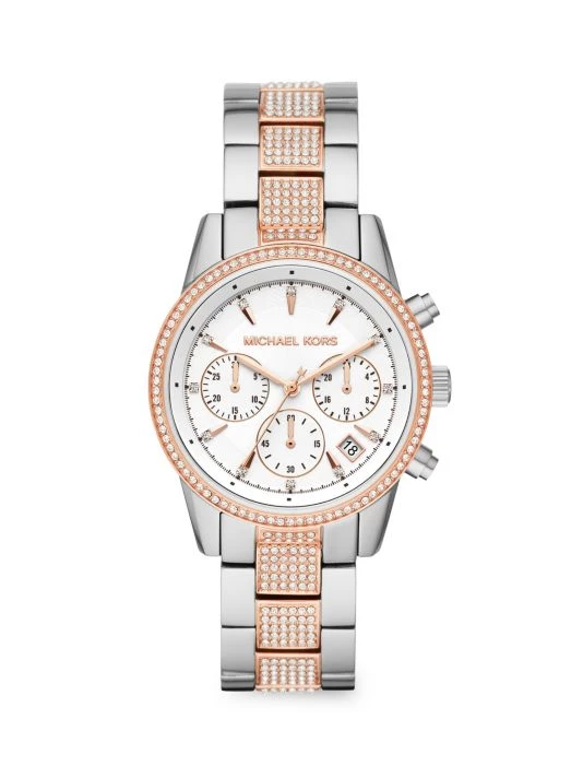 From the Ritz Collection. This 37mm Ritz watch features a silvertone sunray dial with rose goldtone crystal-embellished stick indices, glitz top ring, chronograph movement and two-tone pavé bracelet.